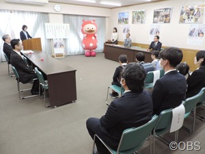 ハッピーキッズキャンペーンは今年で14年目を迎え、今年も県内の新1年生全員に「まるんちゃん♪」の防犯ブザーをプレゼントすることになりました。3月27日(金)に県教育委員会で贈呈式が行われ、OBS猪俣社長が大分県教育委員会の山田教育長に目録を贈呈しました。